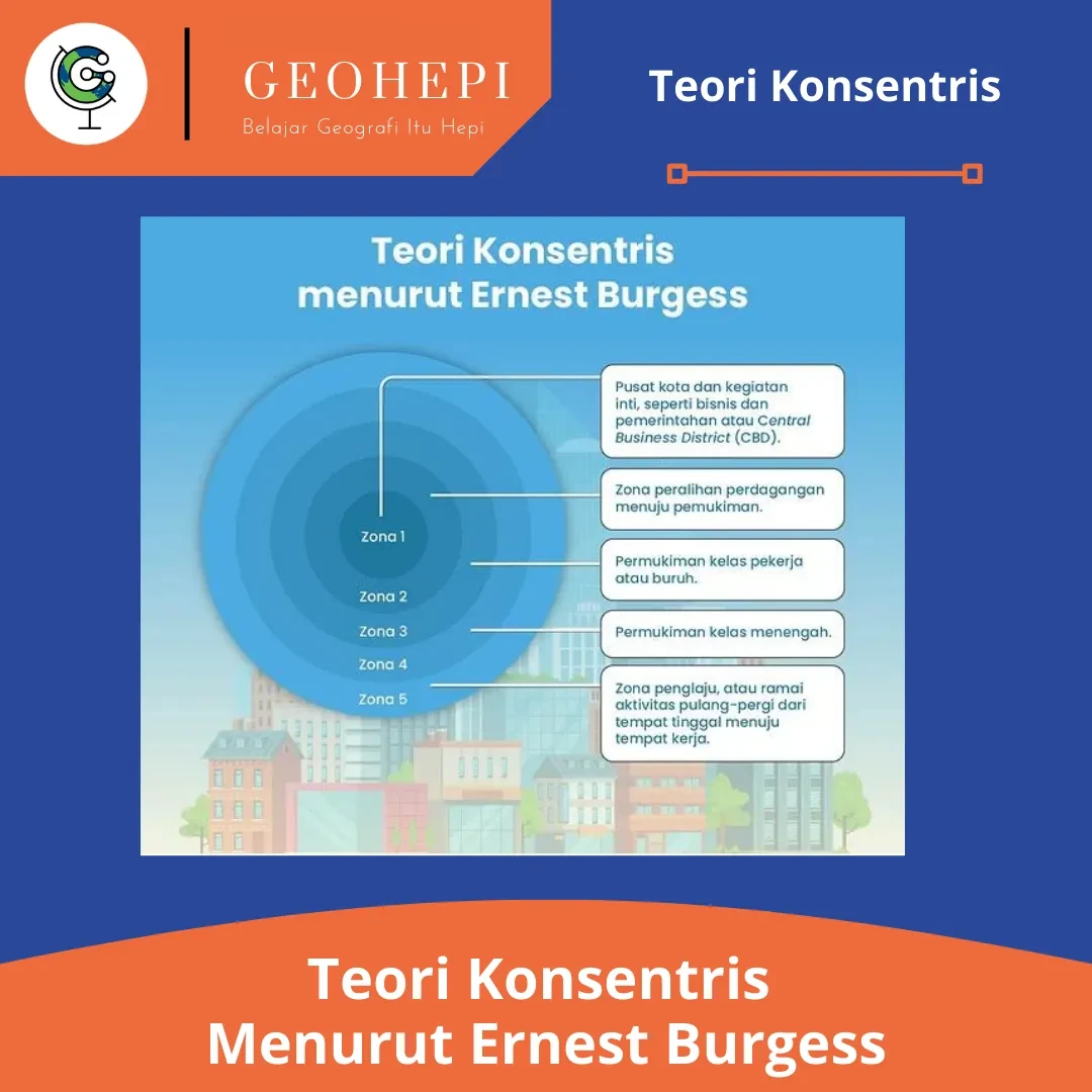 Ernest Burgess, seorang sosiolog asal Chicago, Amerika Serikat, mengemukakan teori ini, yang menjelaskan mengenai struktur kota yang berkembang secara teratur, mulai dari bagian inti kota, hingga ke bagian pinggirannya. Dalam teori ini, pola ruang dari suatu kota semakin meluas hingga menjauhi titik pusat kota. Zona yang terbentuk akibat pemekaran wilayah mirip sebuah gelang yang melingkar dengan pengelompokan daerah atas 5 zona, yakni:
